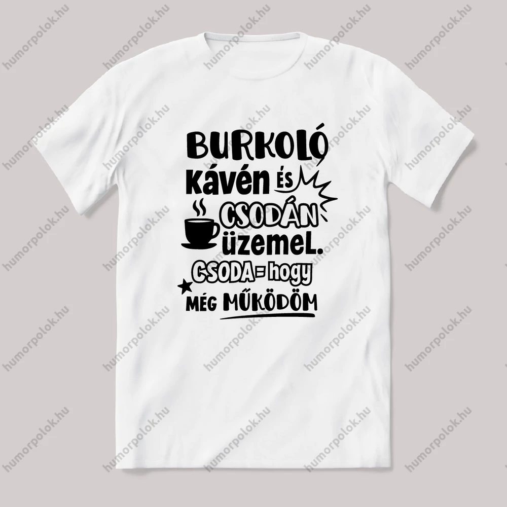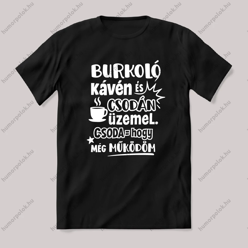 A Burkoló kávén és csodán üzemel, csoda = hogy még működöm. Feliratos vicces szakmás póló.
