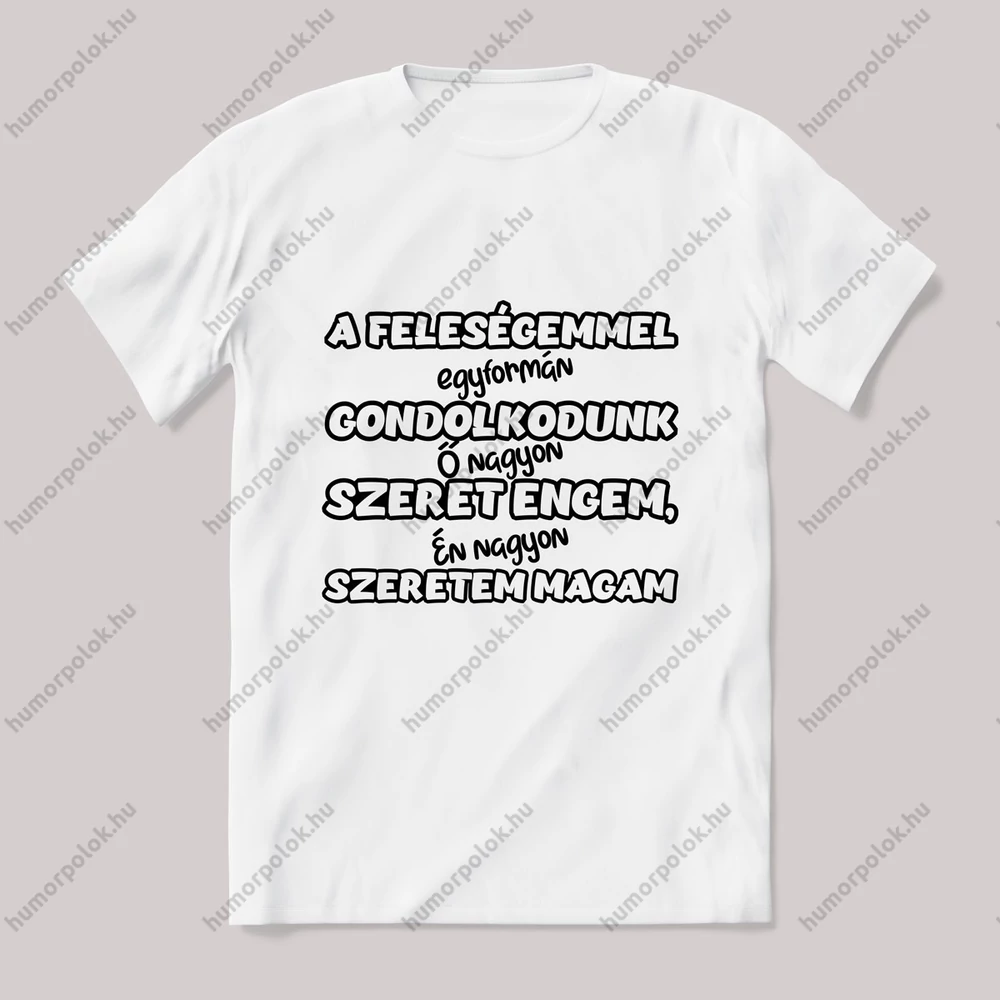A feleségemmel egyfomán gondolkodunk ő szeret enmgem, én szeretem magamat. Vicces feliratos póló.