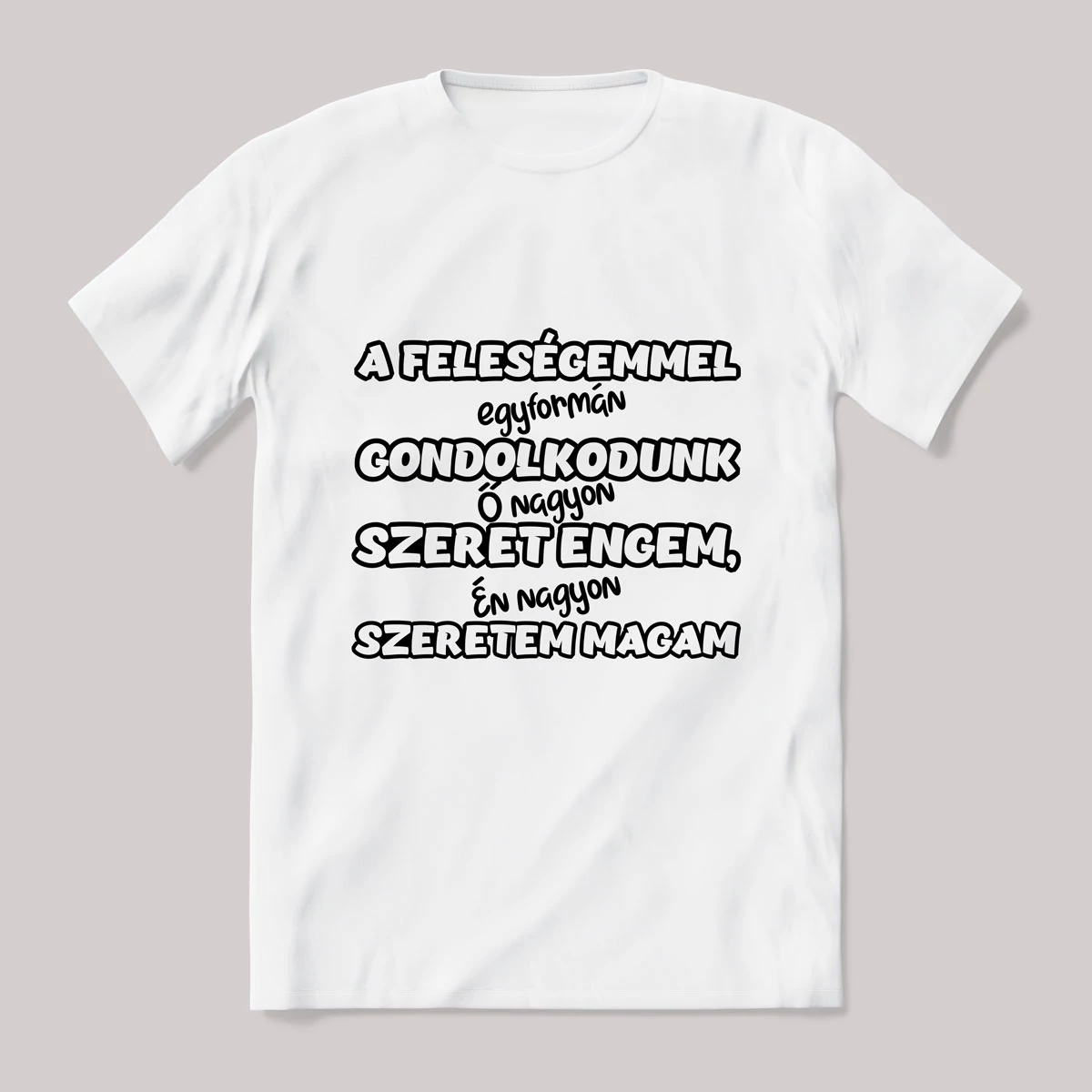 A feleségemmel egyfomán gondolkodunk. Feliratos póló.