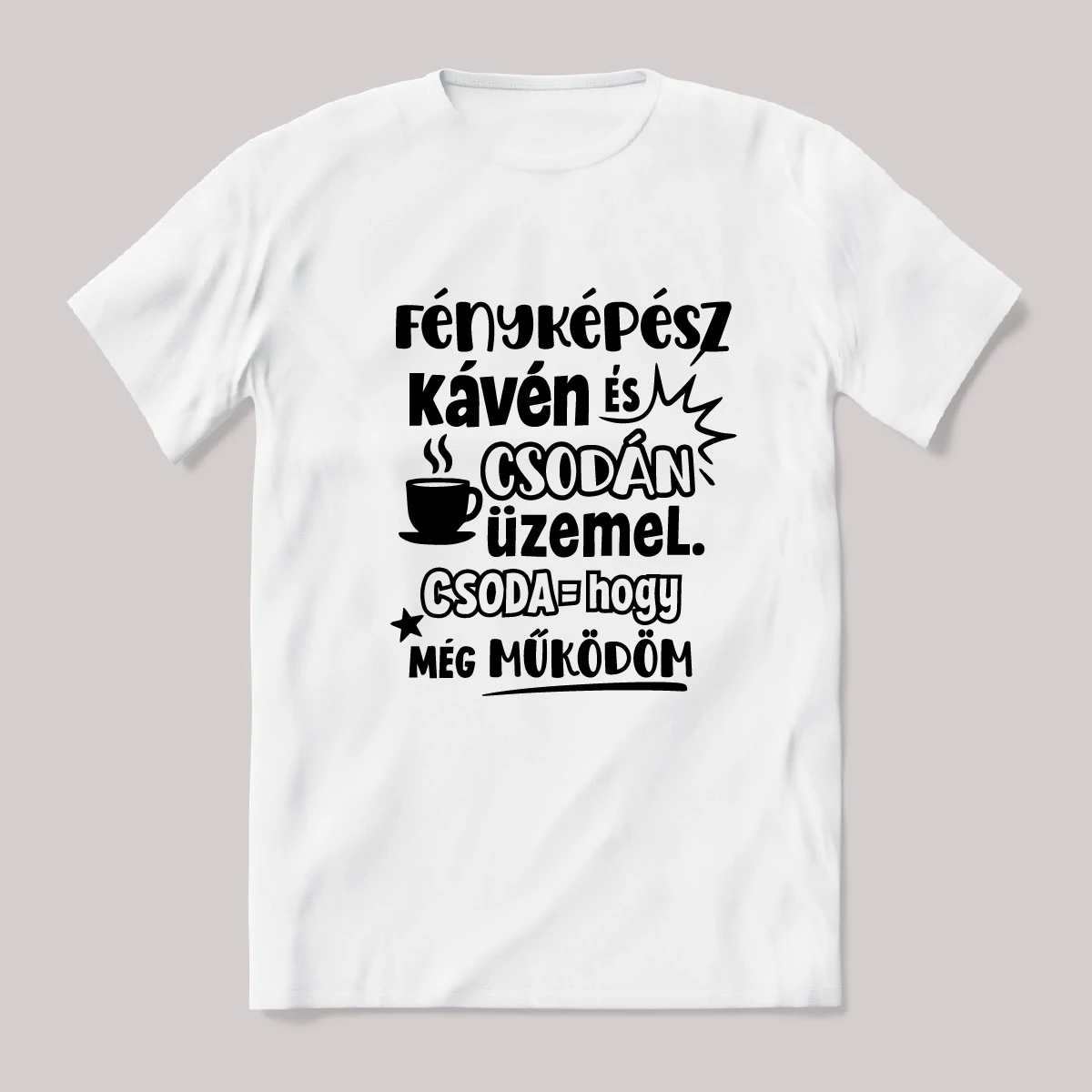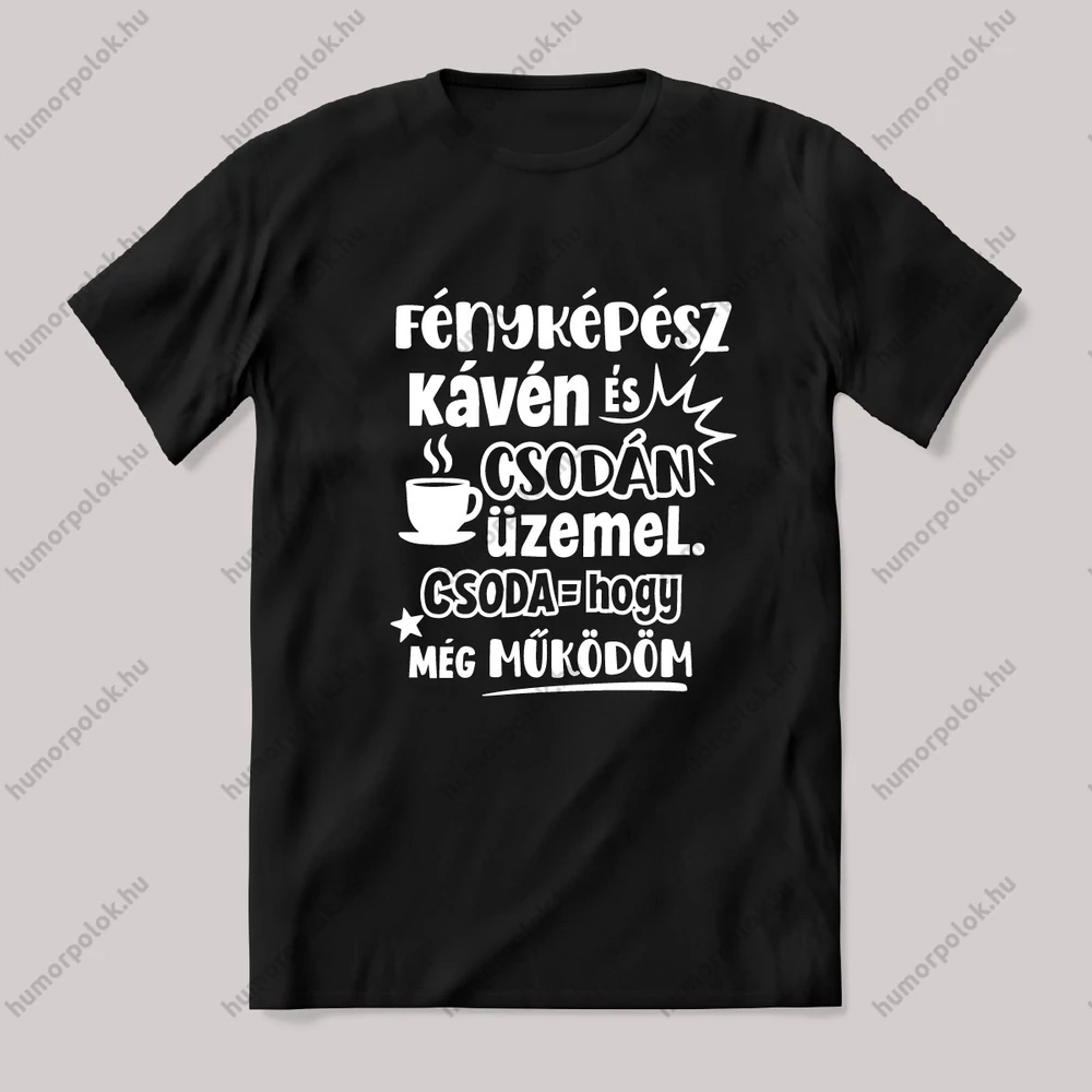 A Fényképész kávén és csodán üzemel, csoda = hogy még működöm. Feliratos vicces szakmás póló.