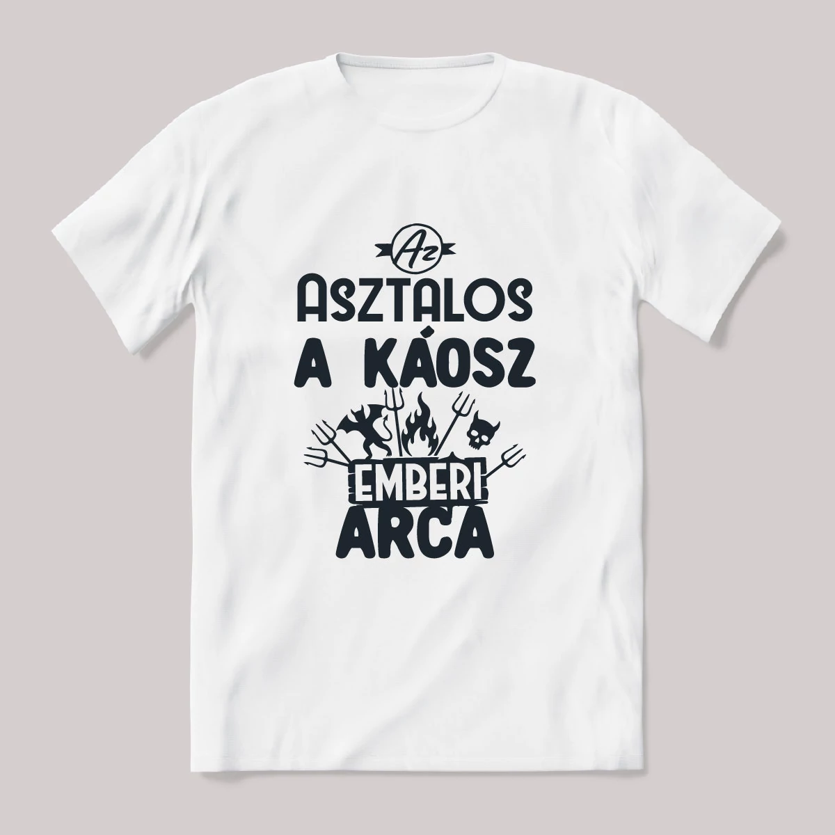 Asztalos, a káosz emberi arca. Feliratos vicces szakmás póló.