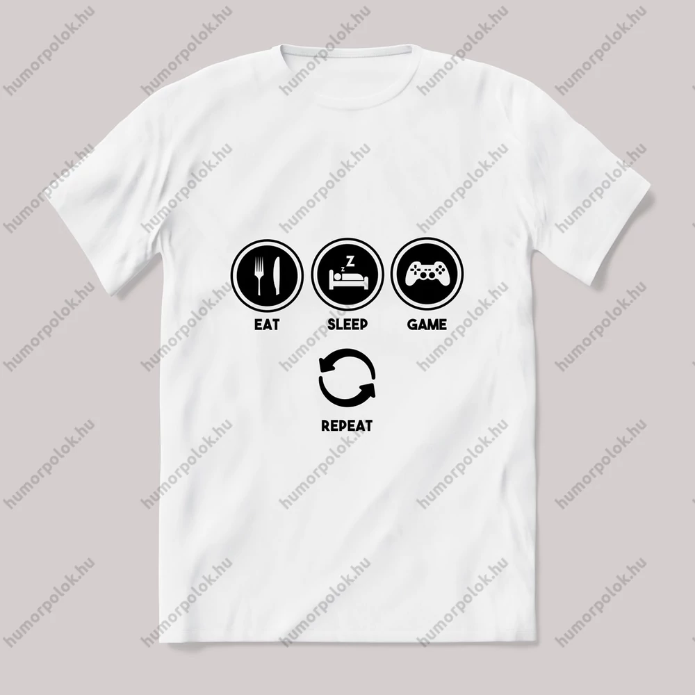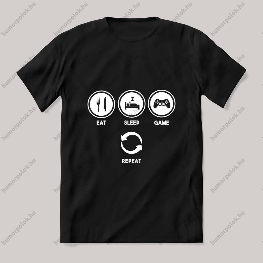 Eat sleep game repeat gamer. Feliratos póló. – ha ezt viseled, mindenki tudni fogja, hogy nem csak stílusod, de humorod is van! Ez a Gamer kategória egyik legmenőbb darabja.