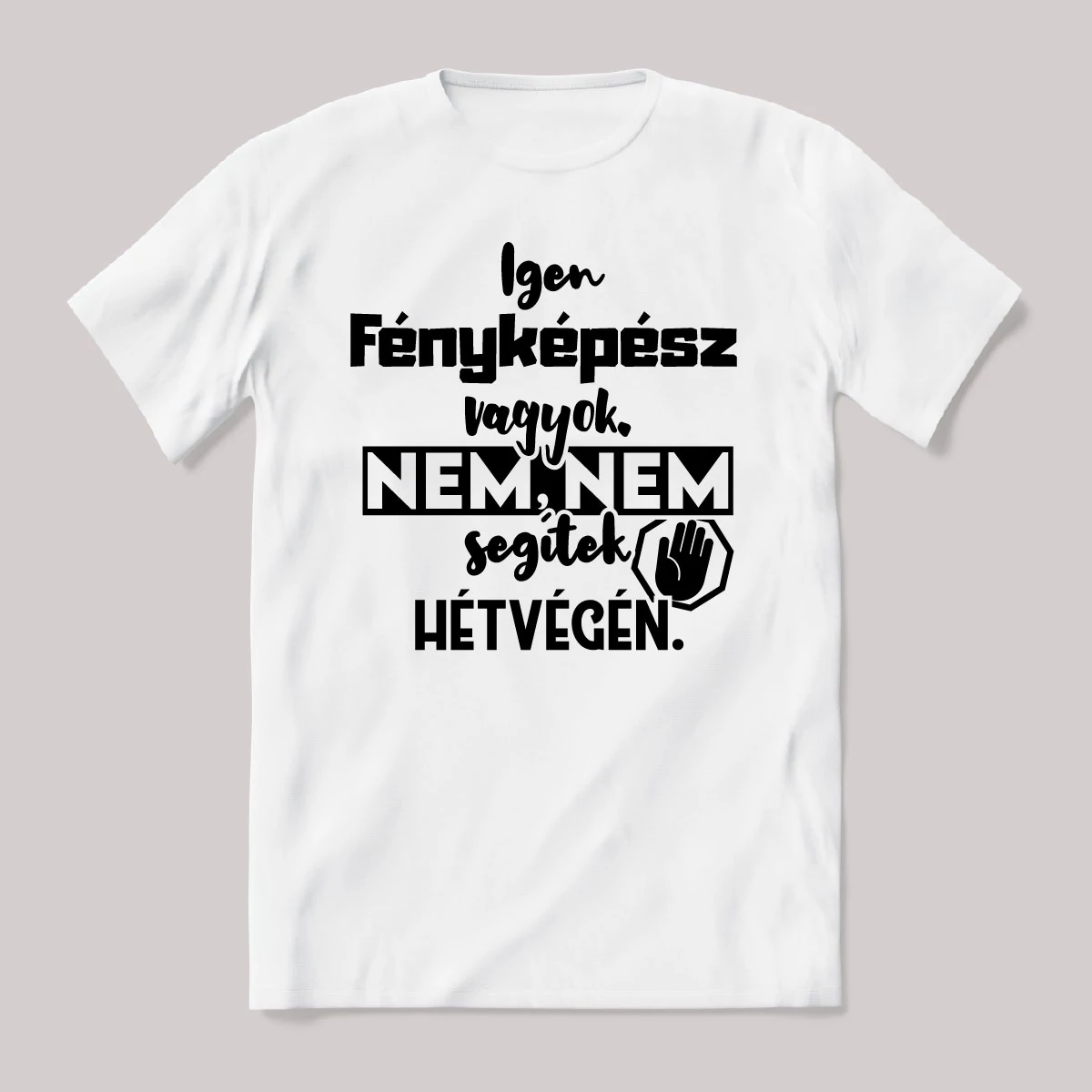 Igen fényképész vagyok, nem, nem segítek hétvégén. Feliratos vicces szakmás póló.