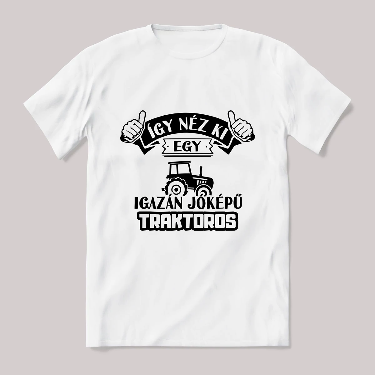 Így néz ki egy jóképű traktoros. Feliratos póló. – ha ezt viseled, mindenki tudni fogja, hogy nem csak stílusod, de humorod is van! Ez a Traktoros kategória egyik legmenőbb darabja.
