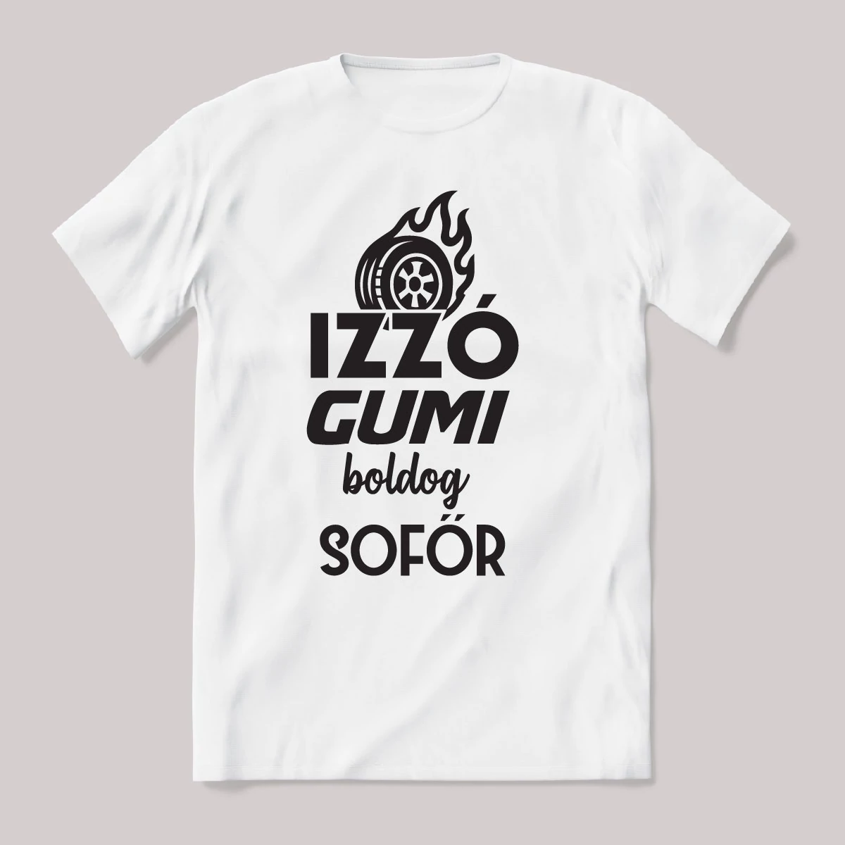 Izzó gumi, boldog sofőr. Autós vicces póló.