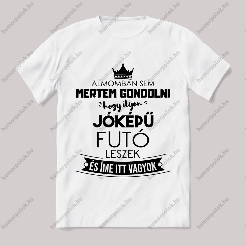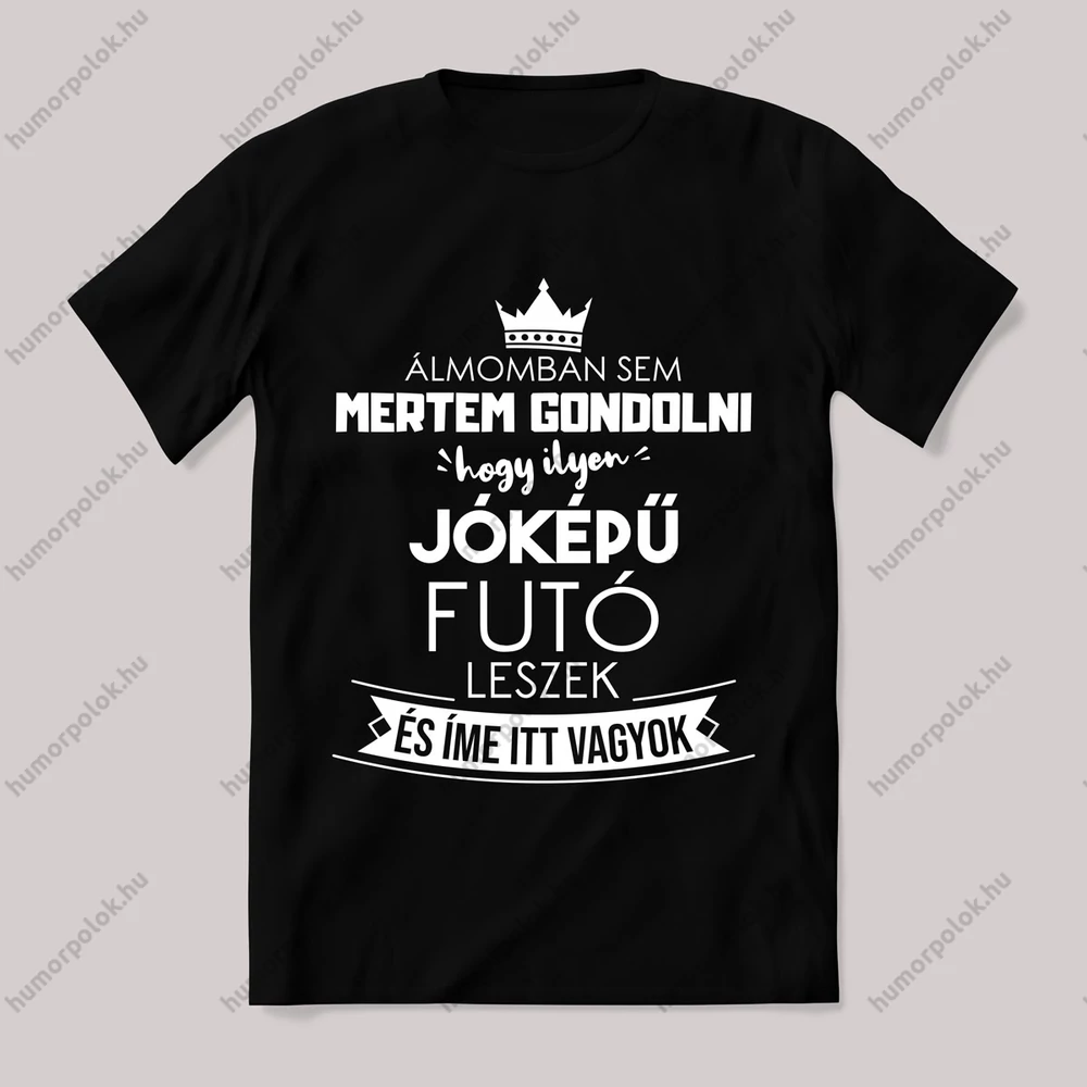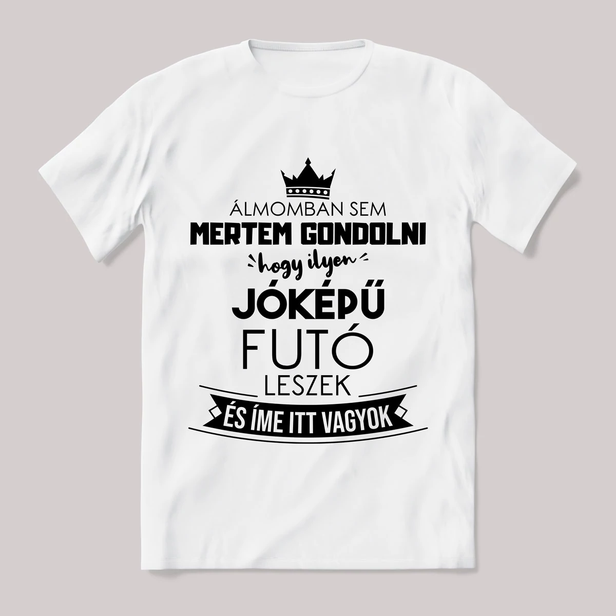 Álmomban sem gondoltam volna, hogy ilyen jóképű futó leszek és íme itt vagyok. Feliratos vicces póló.