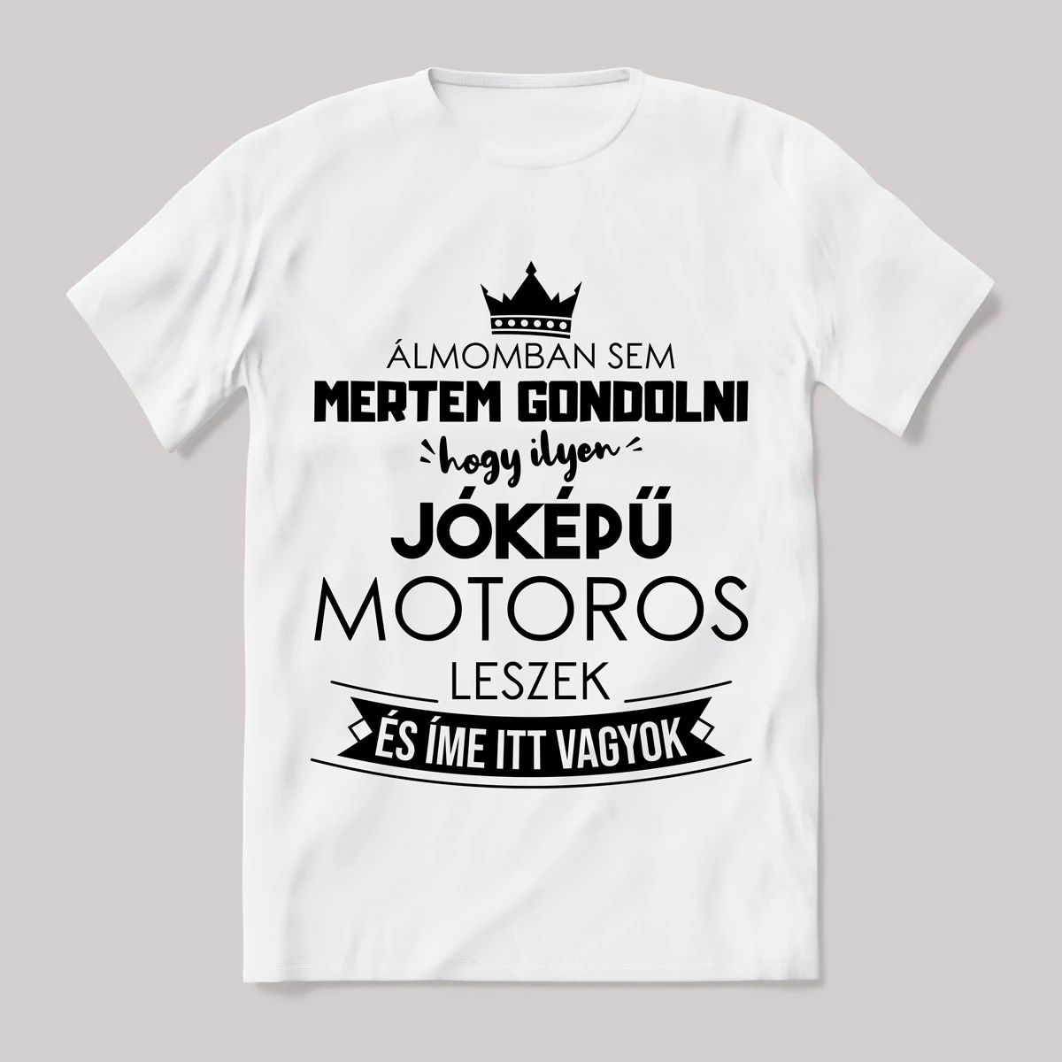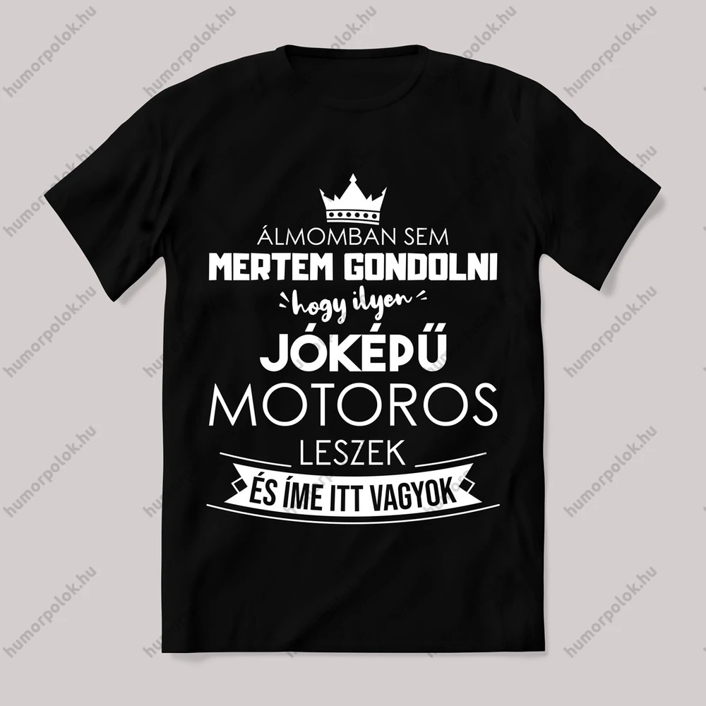 Álmomban sem gondoltam volna, hogy ilyen jóképű motoros leszek és íme itt vagyok. Feliratos vicces póló.