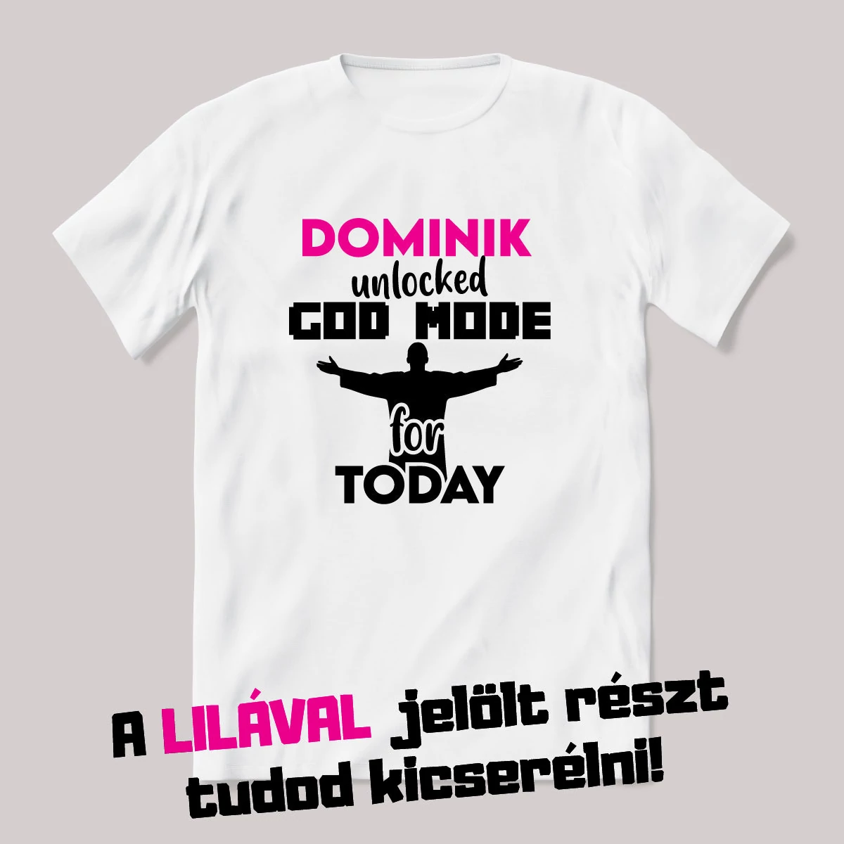 Unlocked god mode today. Feliratos vicces névnapos póló. A termékképen lilával kiírt név helyére bármilyen nevet be tudunk pattintani, amit kérsz.